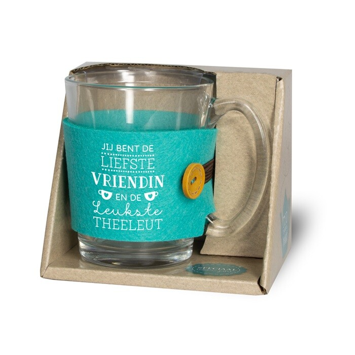 Stijlvol Theeglas omhuld met blauwe, vilten sleeve die bedrukt is met een complimenteuze tekst.