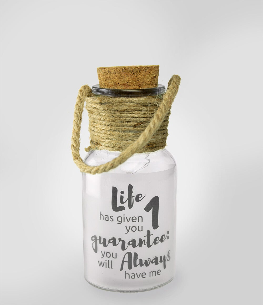 Onder de dop van kurk zit de schakelaar om de lichtjes aan en uit te zetten. Het is ook mogelijk om de fles op te hangen aan het jute koord. Lengte fles inclusief jute koord is 23 cm.